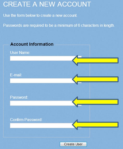 Afterwards, you will be asked to enter your username, email address and the password you would like to use. Please make sure that you keep your password in a safe place. Your registration will be completed and an account will be created for you once you click the “create user” button.